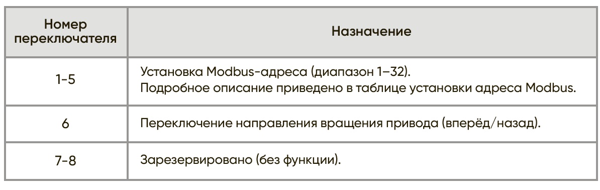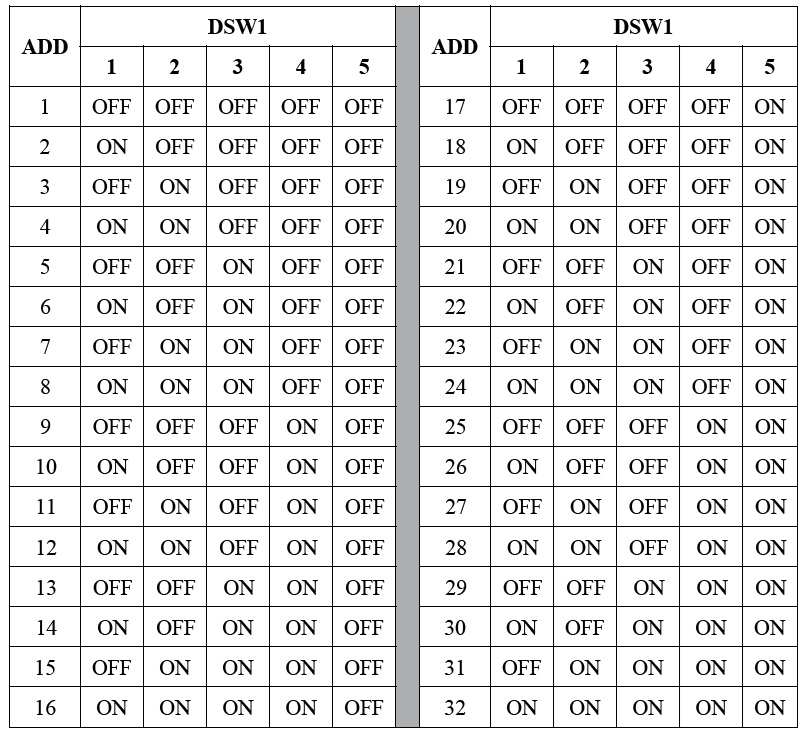 Адрес устройства (ADD) задается с помощью DIP-переключателей DSW1 (1-5).
