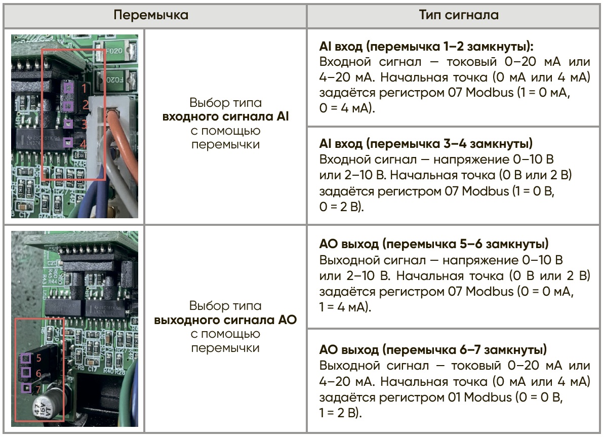 Тип входных (AI) и выходных (AO) сигналов (напряжение или ток) задается с помощью перемычек (jumper) на плате привода, как показано в таблице: