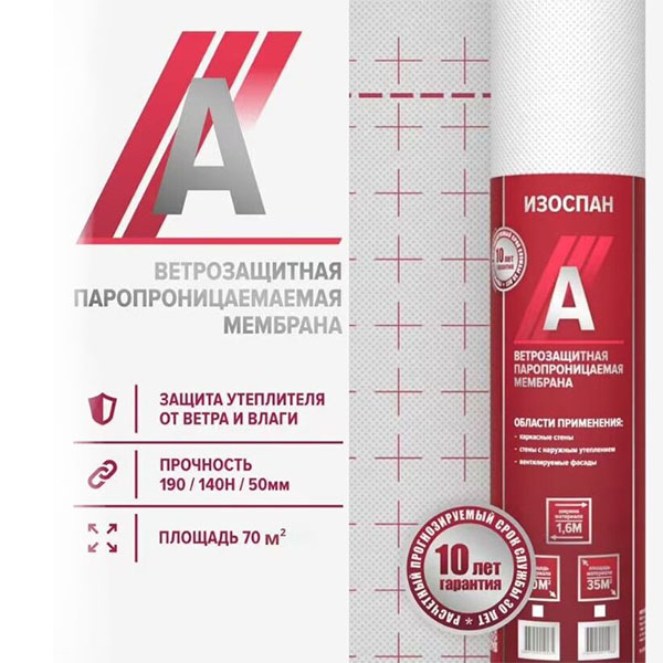Изоспан А– паропроницаемая мембрана, применяется для защиты утеплителя и внутренних элементов стен от ветра, атмосферной влаги, пороши, а также обеспечивает выведение водяных паров из утеплителя в зданиях всех типов. Материал укладывается с внешней стороны утеплителя под наружной облицовкой стены. Применение паропроницаемой мембраны позволяет сохранить теплозащитные характеристики утеплителя и продлить срок службы всей конструкции.