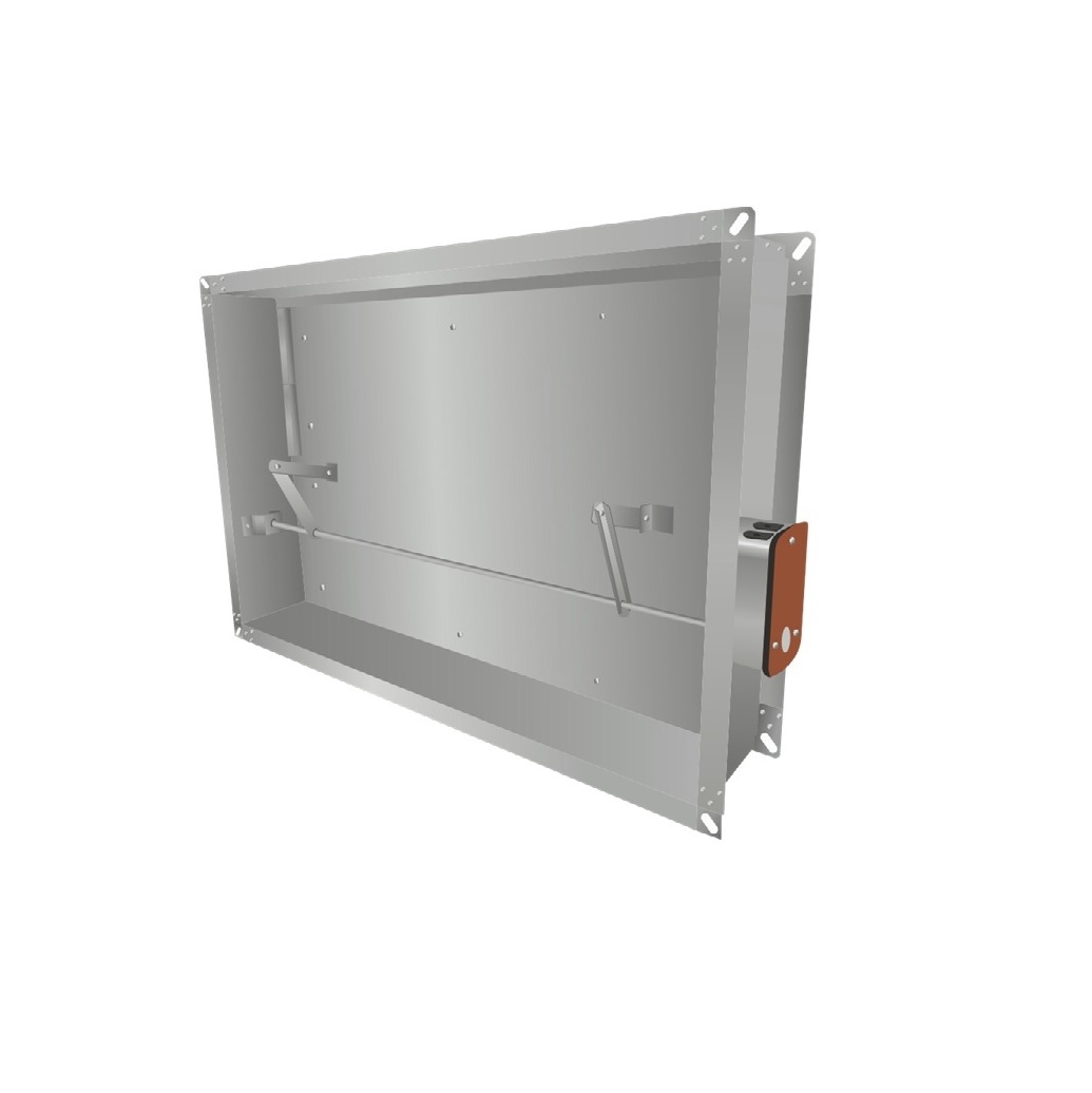 Корпус, в зависимости от огнестойкости и исполнеия клапана имеет глубину от 200 мм до 250 мм и конструктивно аналогичен отрезку воздуховода такой же длины. Фланцы на канальных клапанах шириной 30 мм., на стеновых клапанах 45 мм. Заслонки по типу многослойный сэндвич изготавливается из огнеупорной плиты с двух сторон закрытой оцинкованными металлическими листами.