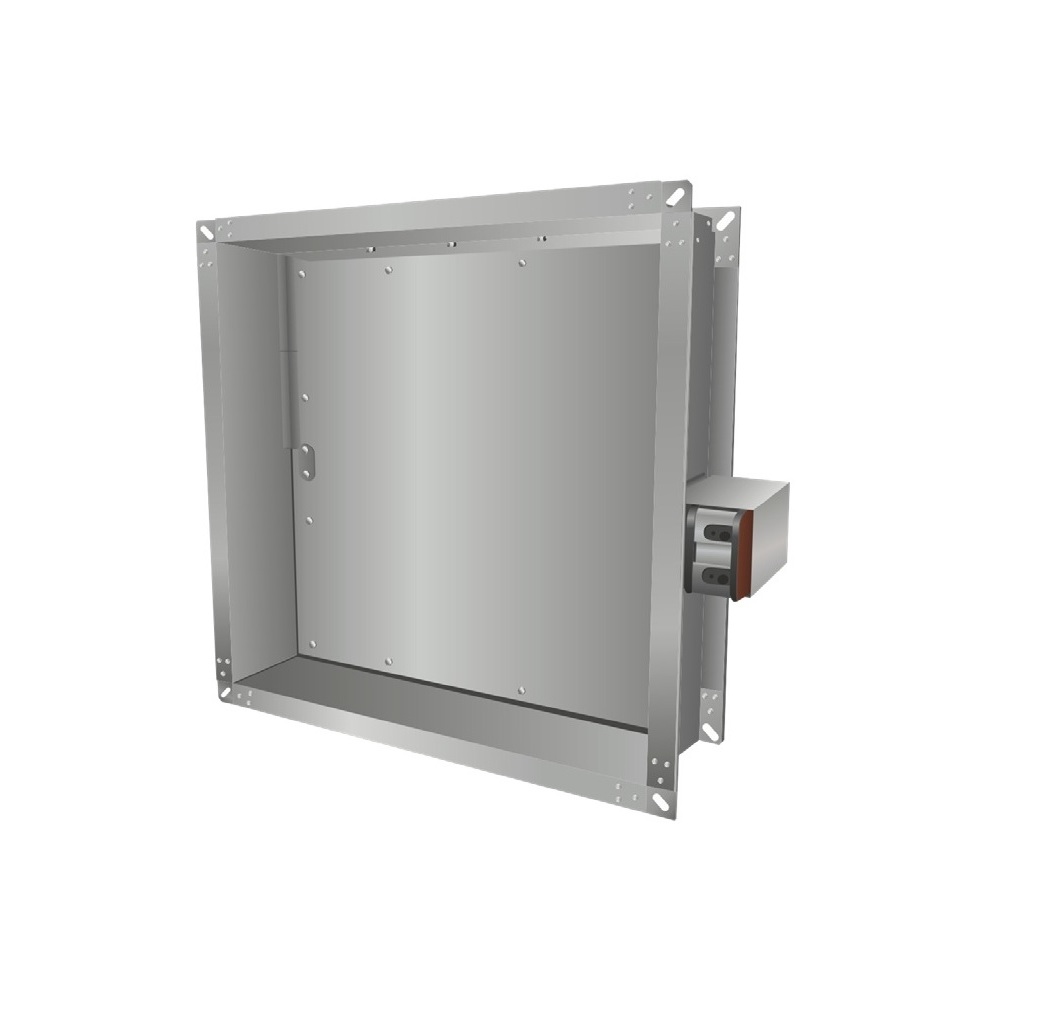Корпус, в зависимости от огнестойкости и исполнеия клапана имеет глубину от 200 мм до 250 мм и конструктивно аналогичен отрезку воздуховода такой же длины. Фланцы на канальных клапанах шириной 30 мм., на стеновых клапанах 45 мм. Заслонки по типу многослойный сэндвич изготавливается из огнеупорной плиты с двух сторон закрытой оцинкованными металлическими листами.
