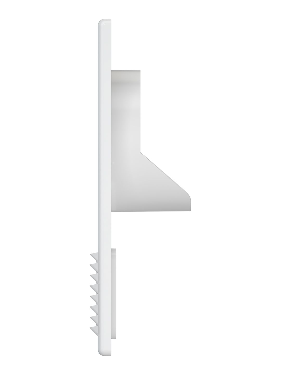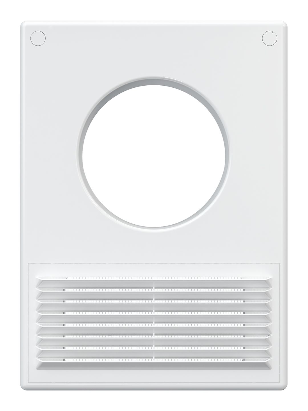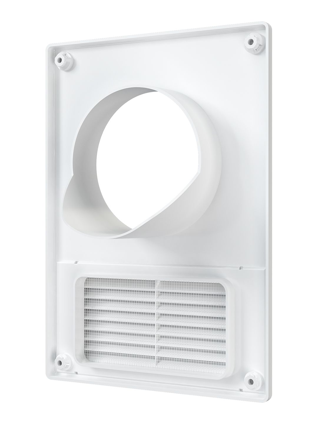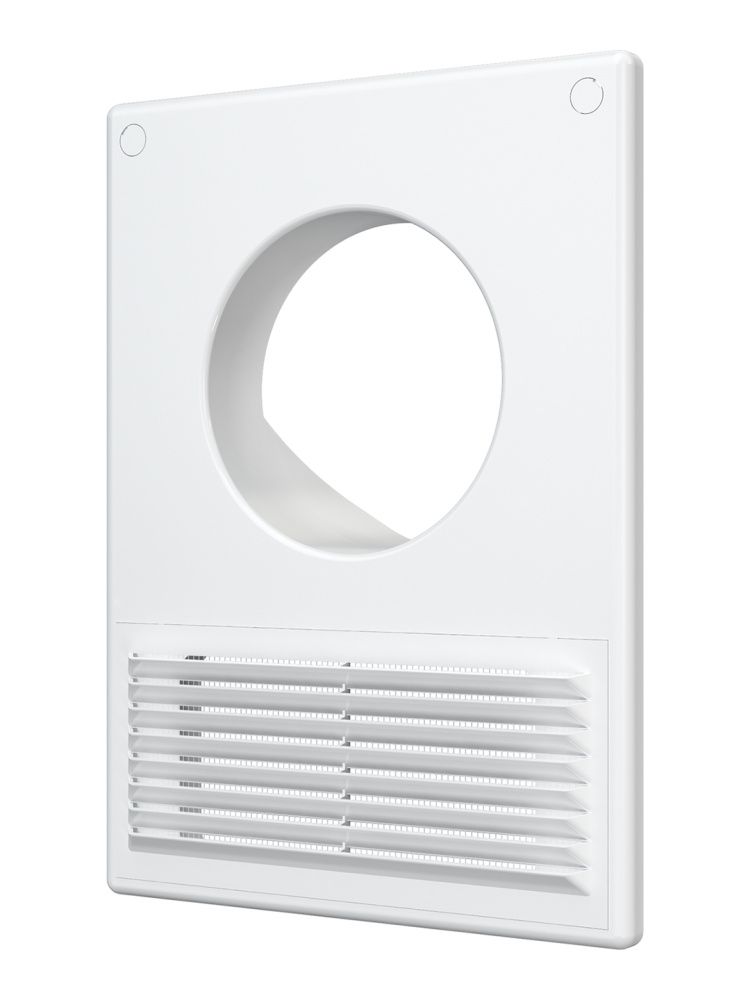 Имеет съемную решетку с наклонными жалюзи, защитную сетку от насекомых и девиатор для предотвращения обратного потока.