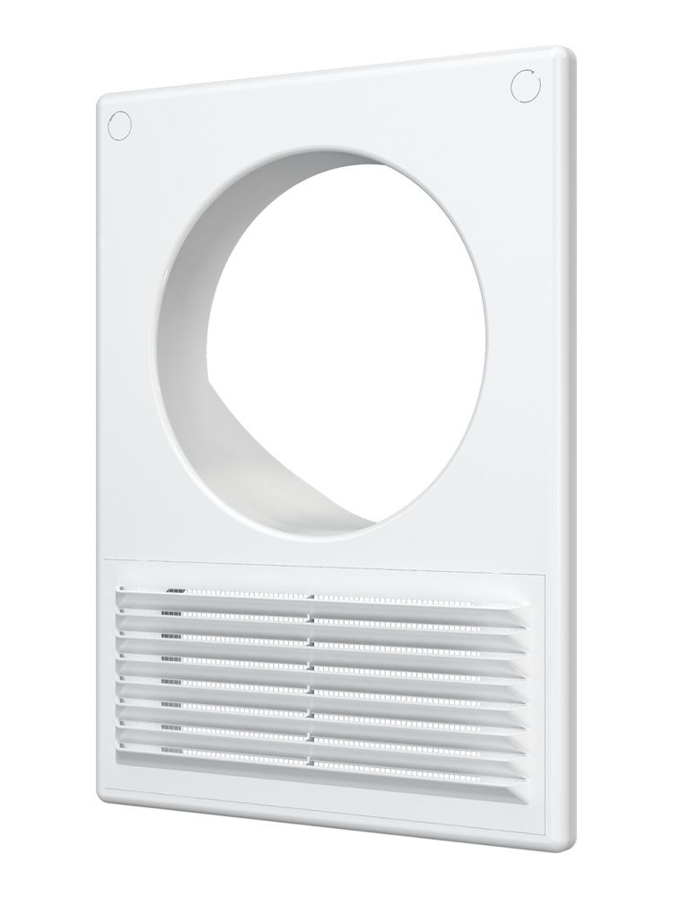 Имеет съемную решетку с наклонными жалюзи, защитную сетку от насекомых и девиатор для предотвращения обратного потока.