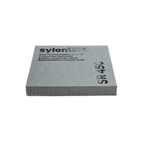 Sylomer SR 450– уникальный материал производства австрийской компании Getzner, применяемый для виброизоляции инженерного оборудования, фундаментов зданий, рельсовых путей и пр. Материал выпускается в рулонах или в штучных опорах заданных размеров (по индивидуальному заказу). В качестве упругого слоя между источником вибрации и защищаемой поверхностью (конструкцией) Sylomer может применяться по всей плоскости опирания, либо фрагментами (под опорными узлами).