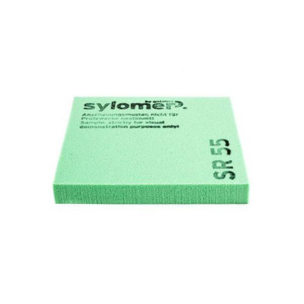 Sylomer SR 55– уникальный материал производства австрийской компании Getzner, применяемый для виброизоляции инженерного оборудования, фундаментов зданий, рельсовых путей и пр. Материал выпускается в рулонах или в штучных опорах заданных размеров (по индивидуальному заказу). В качестве упругого слоя между источником вибрации и защищаемой поверхностью (конструкцией) Sylomer может применяться по всей плоскости опирания, либо фрагментами (под опорными узлами).