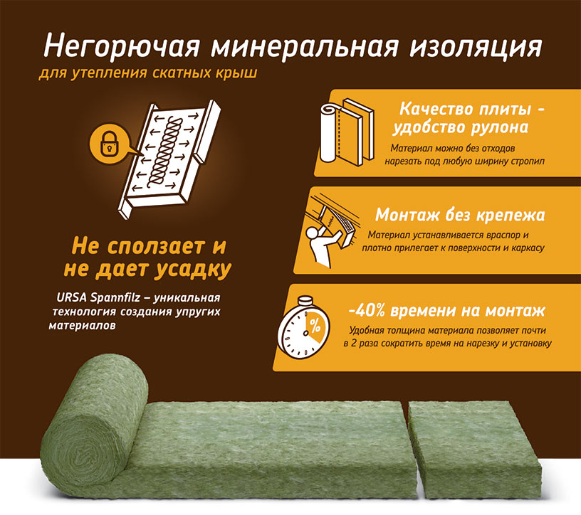 - Материал представляет собой «плиты в рулоне»: это позволяет нарезать мат как вдоль, так и поперек, что особенно удобно при монтаже в конструкциях крыш с нестандартным шагом стропил.
