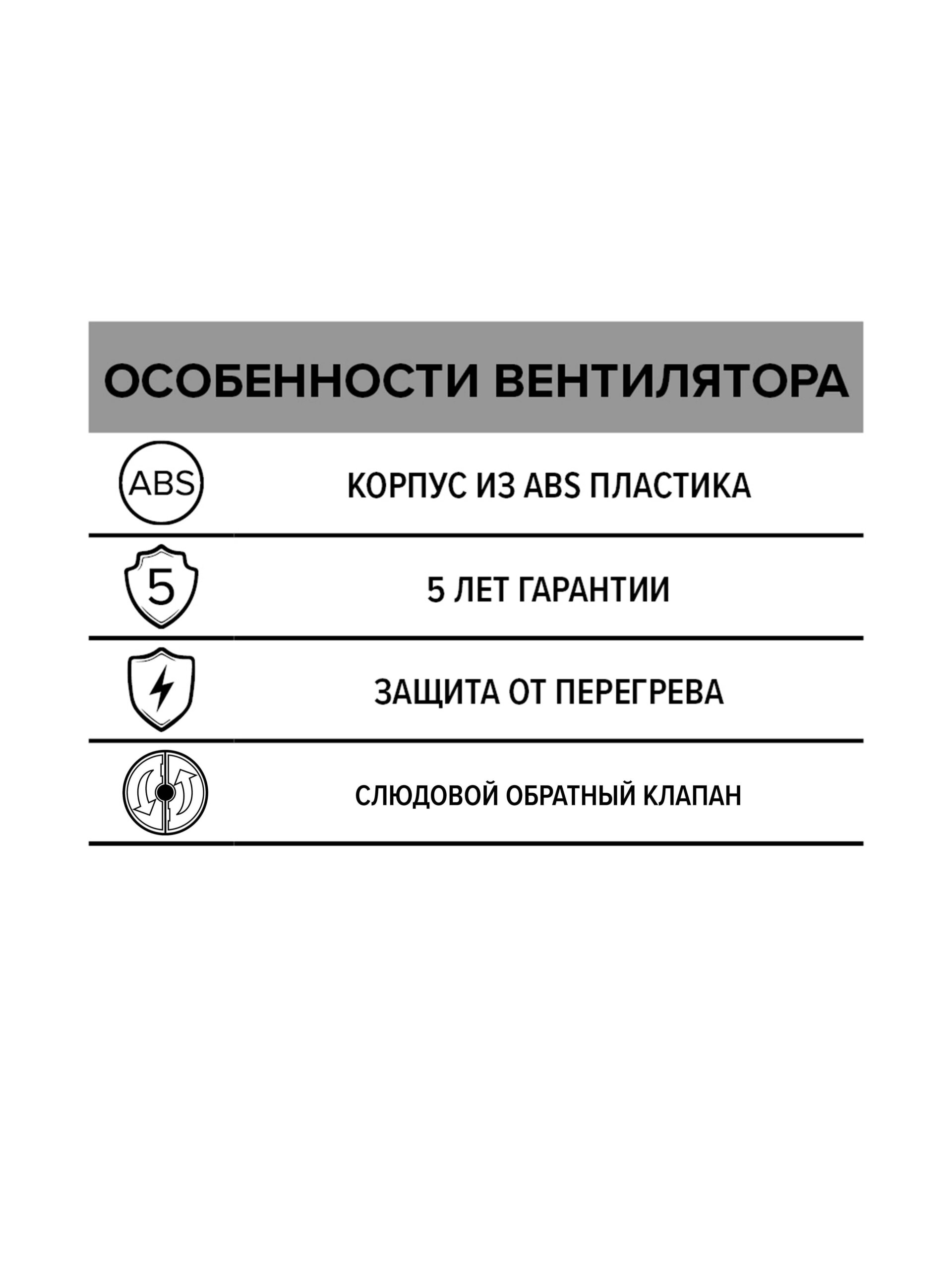 Вентилятор отвечает самым строгим стандартам качества и безопасности. Двигатель на подшипниках скольжения гарантирует вытяжку влажного и загрязненного воздуха. А защита от перегрева автоматически выключит вентилятор при температуре двигателя +115°С – +125°С.